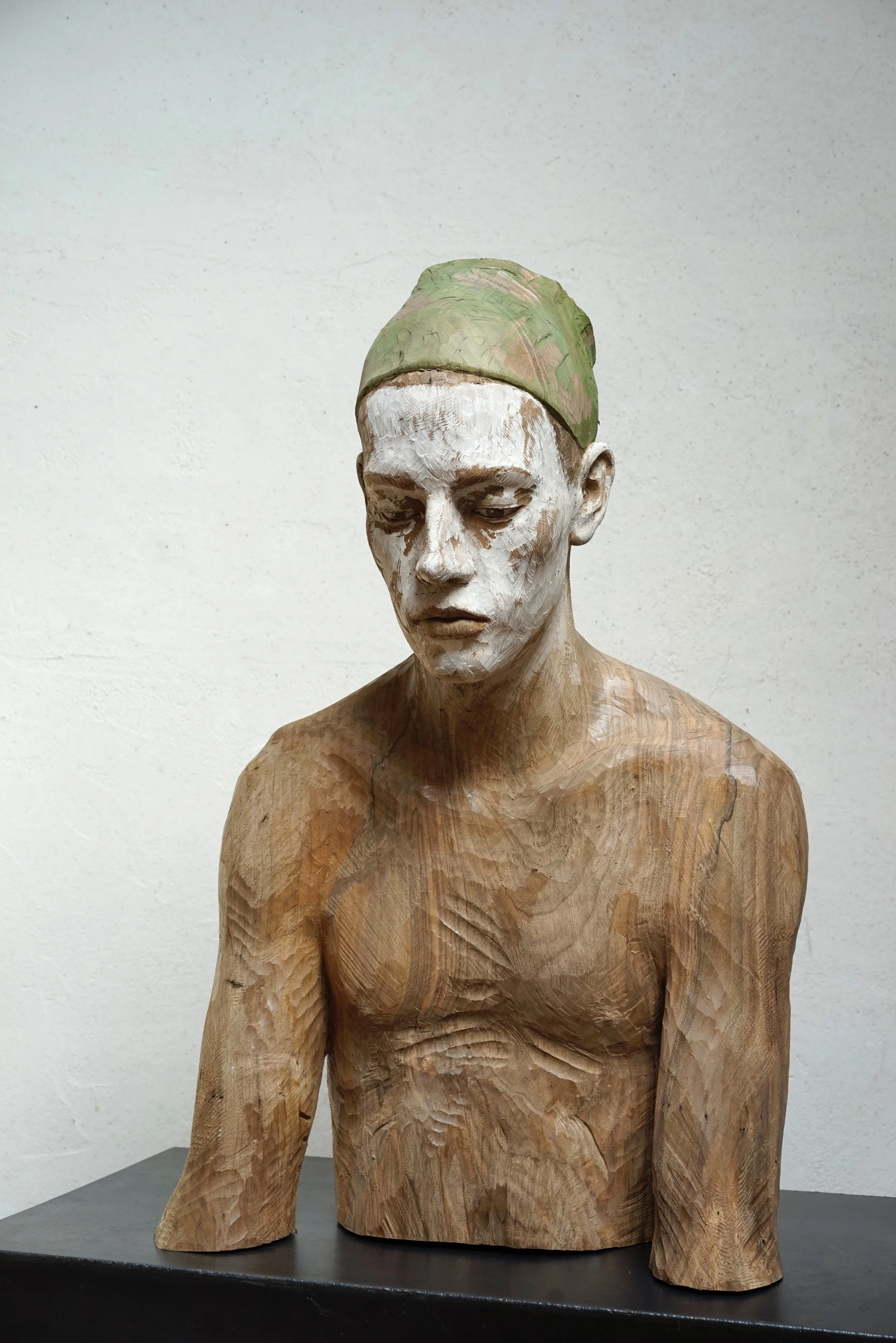 Bruno Walpoth‘s human figures created from limewood or walnut come about as a result of his meeting and dealing with models. On a scale of one-to-one, the bodies, lines and forms of the few young, gaunt men and the myriad of beautiful women take shape from the block of wood by means of his hands. Although Walpoth is attracted to producing concrete likenesses of body parts, such as a shoulder or ankle, and he is pleased with the successful outcome, his concern is not only for a hyper-realistic portrait of the person who stands before him: In his or her outward appearance, the model serves as a cover surface for implied projections. Granted, the facial features and body forms correspond to those of the models, but Bruno Walpoth reduces the strong individual characteristics of the personality in his sculptural representation - those that would constitute the individuality in the classical sense of the portrait.