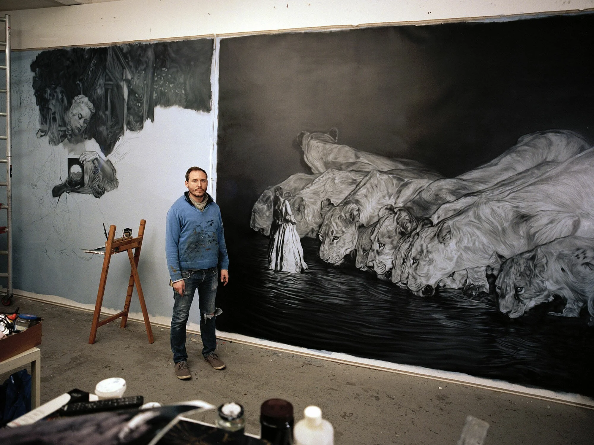 The multidisciplinary artistic work of Stephan Balleux, expressed through a variety of mediums (painting, drawing, animated video, sculpture, etc.), resembles a reflective quest into the essence and meaning of pictorial practice. His work explores the illusionistic techniques made possible by imagery to question human perception, creating visual compositions that challenge the observer’s expectations. A recurring element in his work is the fluidity of materials, whether natural or artificial. He also draws on historical (general and art history) and cultural references (notably zoology, cinema, architecture, anthropology, and literature) to enrich his reflection and deepen his inquiry into the human condition.His recent approach revolves around questioning the ongoing paradigm shift that is disrupting not only the perception of images but also their production, driven by the rise of generative algorithms.