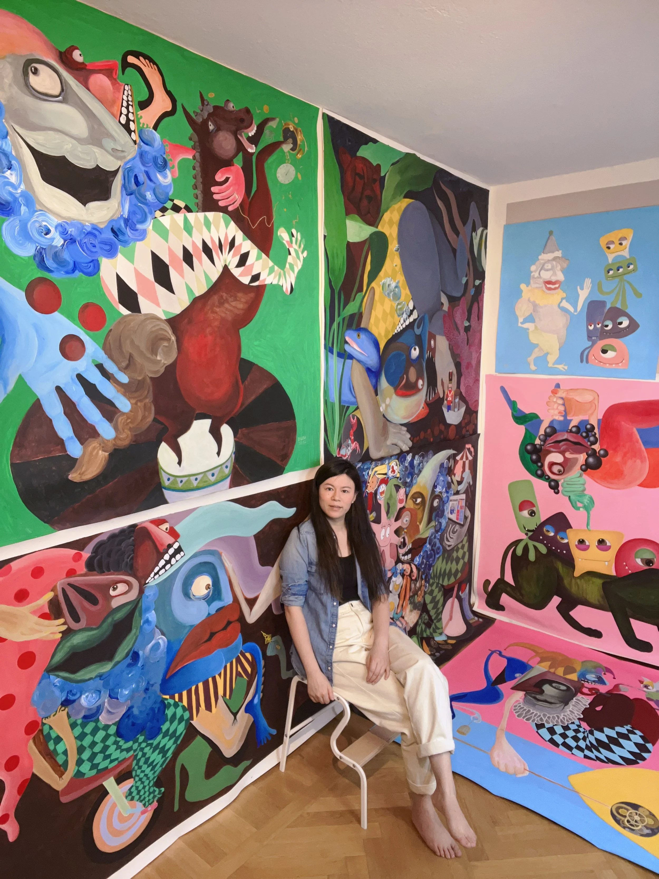 Lou Daohua inherited her creativity from her grandmother, who often made and sold textile toys and home deco after retirement and taught her to craft. In elementary school, she spent two years learning traditional Chinese painting, which centered on self-expression other than being objectively precise and set the tone of her mindset regarding art. She moved to Sweden after graduating from university with a science degree. Living in a completely different culture led her mind to embody a fusion of Chinese and European influences, and the marriage of cultures is reflected in her artwork. Her figurative paintings and ink drawings tell stories of inner conflicts and embracing life changes. The figures in her artwork are characterized by their depictions of multiple faces, dynamic body postures, and bright color schemes that convey various emotions, struggles, and reconciliations. She delves into the complexities of reconciling different identities and feelings through her practice to discuss self-awareness and acceptance.