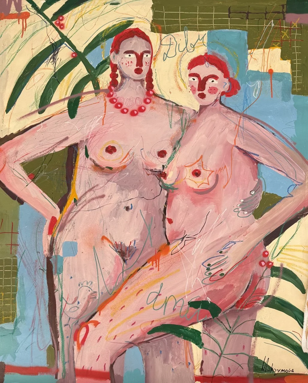 Instead, they often depict colorful nude or partially nude figures who refuse to function as objects of consumption. They dance, intertwine with others, explore their own bodies and merge with the world around them, emphasizing a form of bodily autonomy. The viewer does not simply look at a body but is confronted with the fact that this body already exists — independently of the viewer’s gaze.
