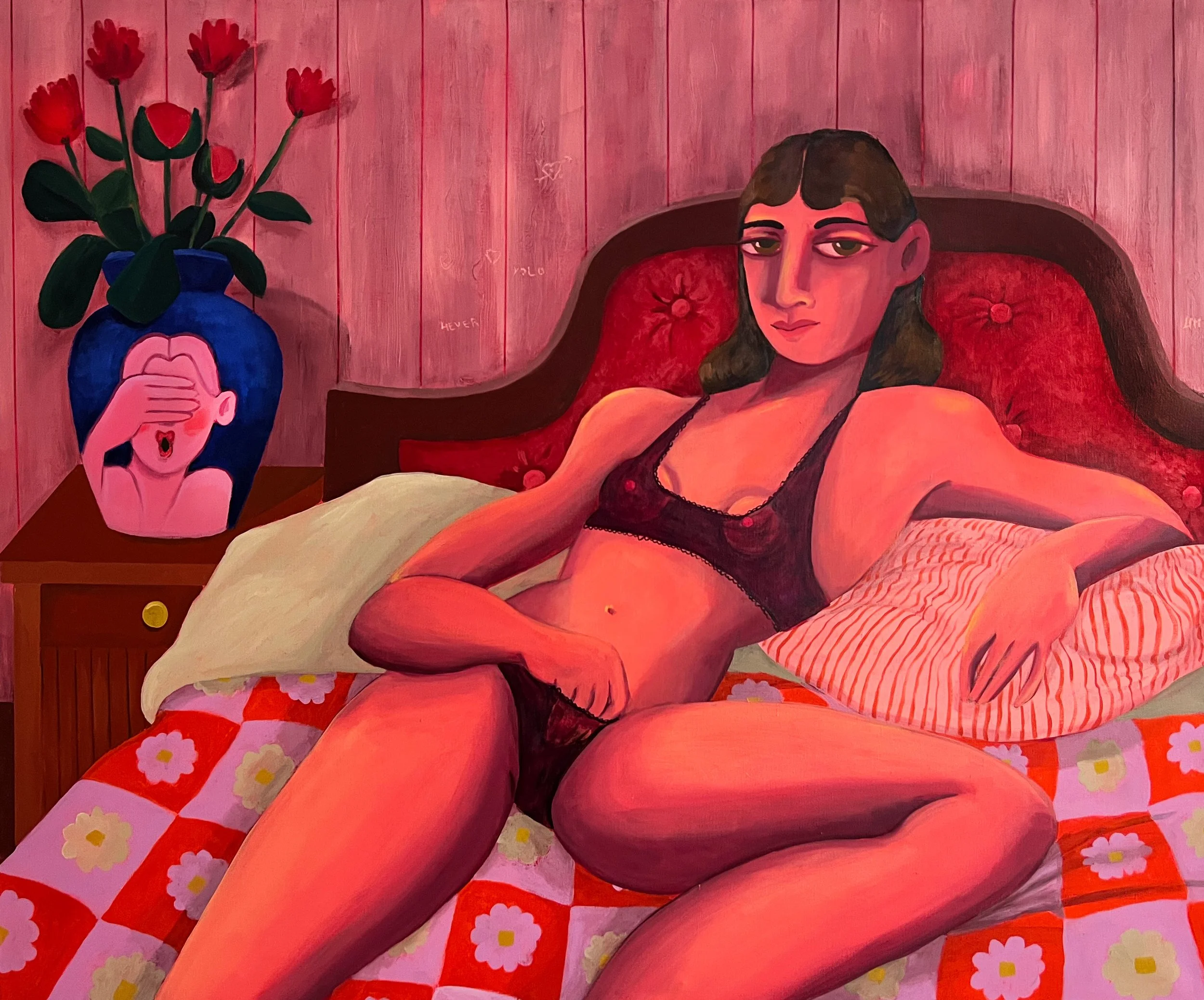 Colour acts as emotional architecture in Van Meerhaeghe's paintings. Fuchsia bodies against midnight blue walls, coral flesh on orange grounds, crimson flowers bursting from deep blue vases — her palette is unapologetically bold, carrying affect and psychological intensity.