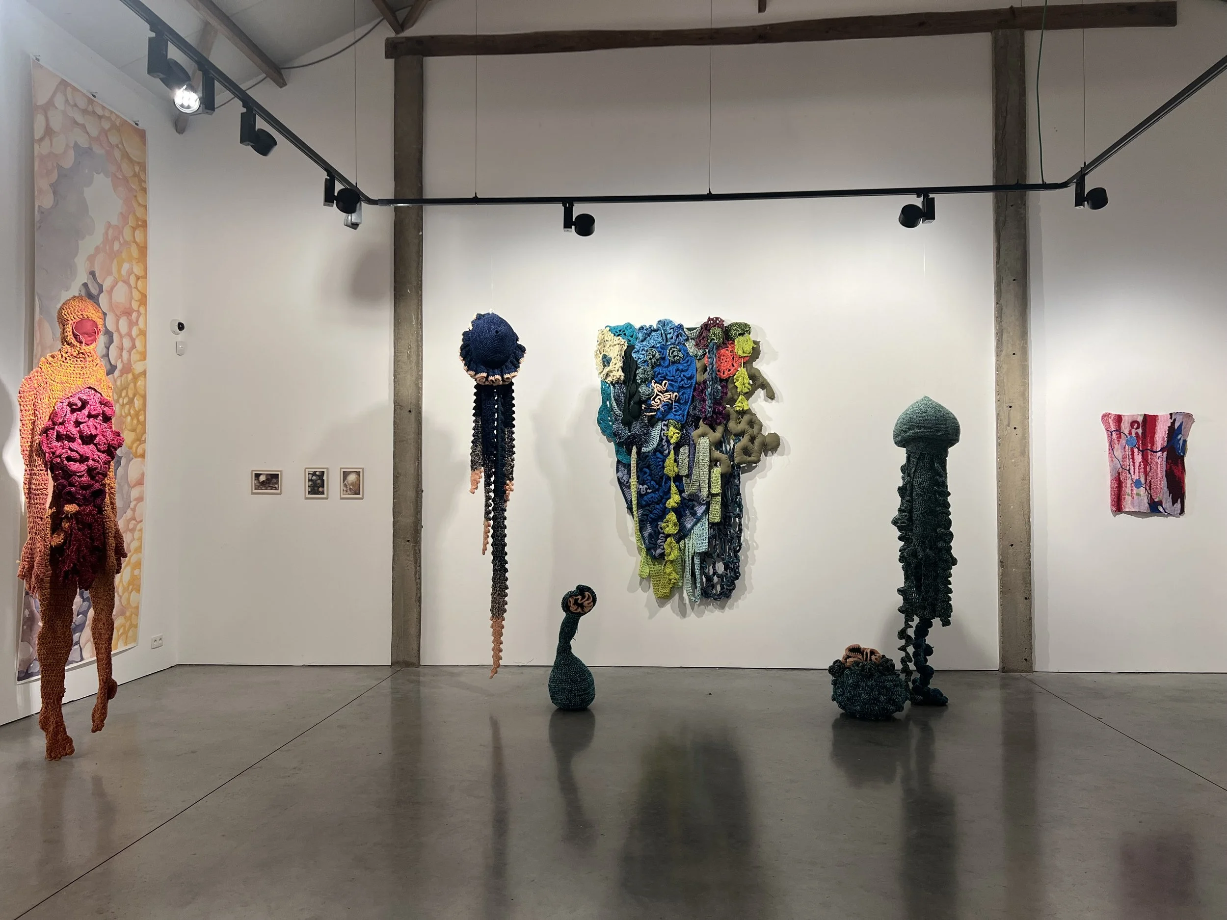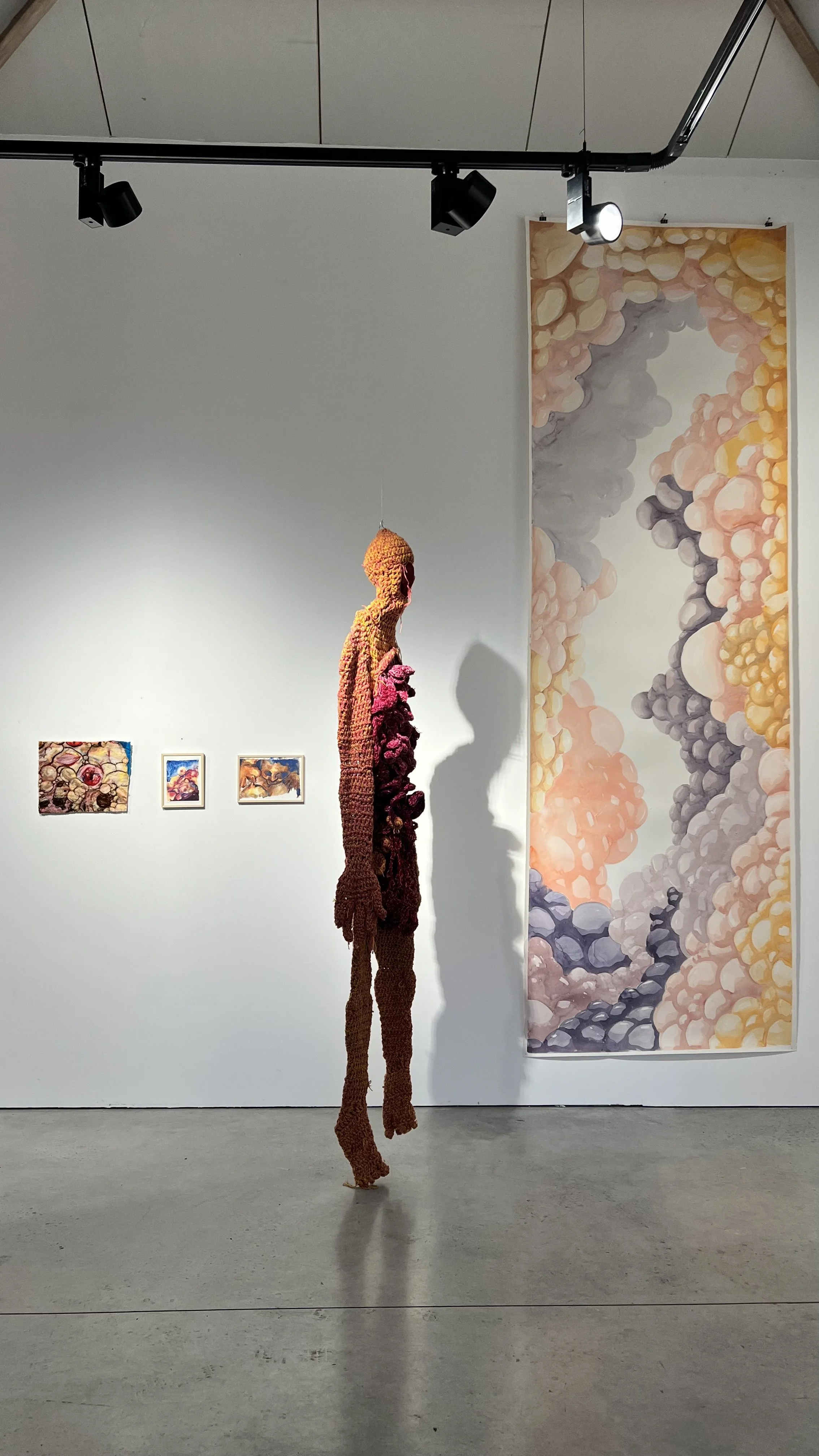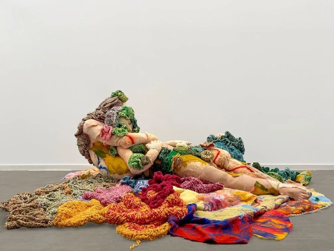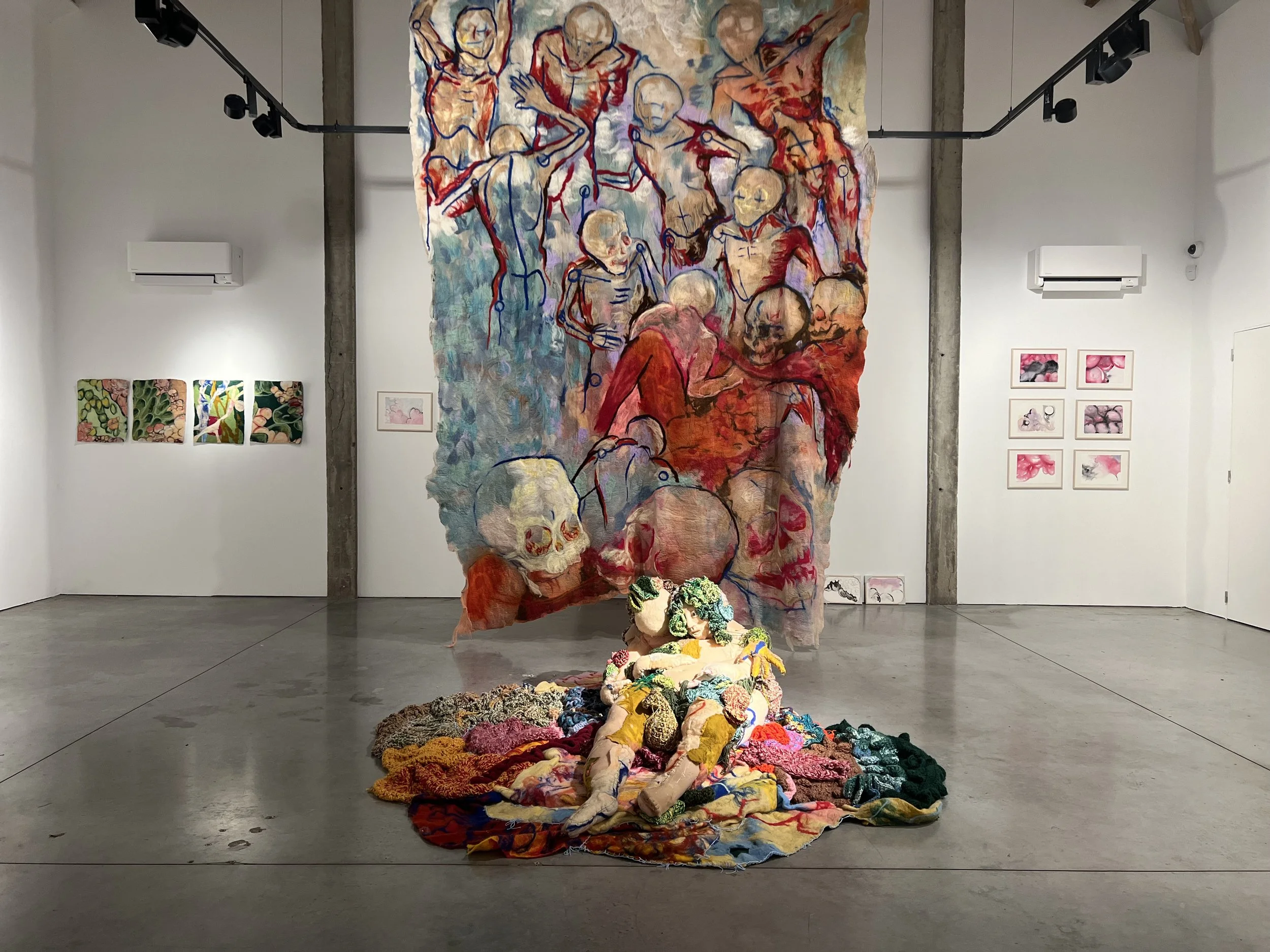 In Soft on the Inside, large textile tableaus and an installation of watercolors and small-scale felt pieces of wet and needle felting with natural wool are accompanied by an almost immersive, so-called soft sculpture of a human figure constructed by embroidery and crocheting. By doing so, the Peruvian artist aims to portray architectural spaces and landscapes constructed by layers resembling skin, organic patterns, bumps, and textures as if built on the inside. As a result, Abaddon juxtaposes the anthropomorphic with the architectural, the internal with the external, and the soft with the voracious.